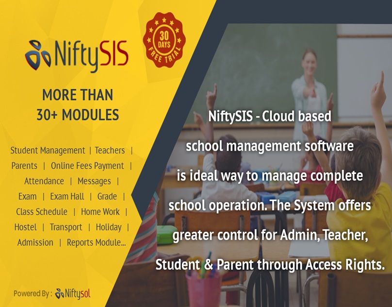 Nifty sis is a web-based school ERP system developed to help educational best school management software in India simply and user friendly by understanding their requirement with more than 30+ modules like student management, School Fees Software, login, Admin Panel Student Profile, Teacher Profile, Admission Management, School Administration, Manage Students, Teachers, Fees Management, Library Management, Bus transport system, Management, Time-Table Management, Staff Management, Teacher Task Management, Manage Students Result., Manage Notification About School, and school attendance management system, etc...nifty sol is a web-based ERP which makes it accessible from anywhere using the internet. It is fully customizable according to clients' requirements. Useful for not only in a single institute but also in multiple institutes means if someone has more y can than one school or college. All the modules our School ERP software are working nicely with simple to use interface. One can get support for 24*7 hours for any problem. For more details, you can contact us on our website https://www.niftysol.com/niftysis/ call us on +91 7940069459