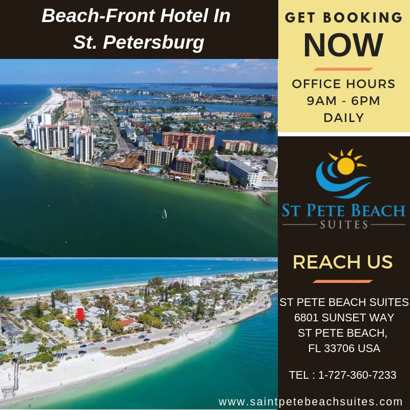 Feel the endless beauty of the beach. Saint Pete Beach is known as the sunset capital of Florida. St. Pete Beach offers the wide variety of enjoyable activities. Whether you want to party, exercise, retreat wine and dine, to explore arts and adventure also the all of these things are waiting for you. We are at Beachfront hotel in St. Petersburg beach. We are certified by the TripAdviser as a certificate of excellence 2018. You can see dolphins leaping and playing in the ocean, jet skiing, kite surfing, sailing, or go parasailing, hop on a ferry every year, St. Pete Beach hosts over 900 events every year. If you want to the variety of enjoyment at one spot then go for it and for more details or discount offers so feel free contact at 1-727-360-723.