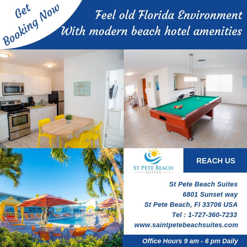 If you are looking for the hotel in Florida that contains modern beach hotel amenities with old Florida environment, then you are just one click to away. Since 1948 Saint Pete Beach Suites hotel has been receiving guests as the Dolphin Hotel, a piece of Florida history, and when the new owners worked their magic with a full remodel in 2017. St Pete beach Florida hotels are just a few steps from the pristine beach and silky-white sand, within walking distance of your new favorite restaurants and shops. We have 27 beautifully appointed suites are available in different unit sizes, each one boasting full self-catering amenities for both long and short stays. We are the quintessential good-feeling hotel that keeps guests coming back again and again. We also have a three-bedroom house available for bigger groups. Currently we are providing latest discount offers. For more detail feel free to contact at 1-727-360-7233 and get running offers / discounts. We will very happy to assist you.