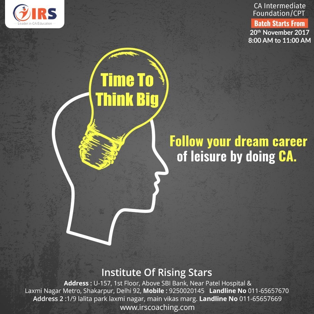 The IRS is reputed as the best institute for CA in Delhi. IRS provides the best training to clear CA intermediate and CA foundation exams in first attempts. If you join IRS and complete the coaching, then you’d definitely be able to complete all your CA exams.