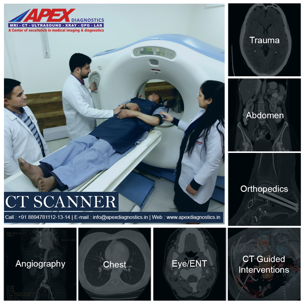 Himachal 24HRS open CT Scan test in Apex Diagnostic have all test just like Trauma, Chest, Abdomen, Orthopedics, Eye/ENT, Angiography, CT Guided Interventions.