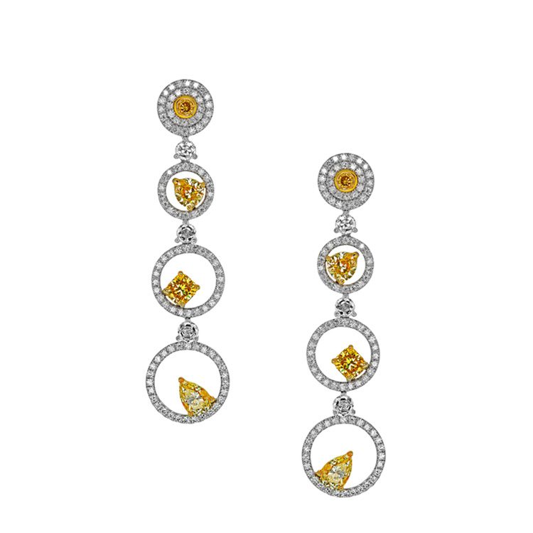 These concentric rings of white gold set with fancy yellow diamonds are like skipping stones across a pond – and equally as mesmerising. Adorned with fancy yellow diamonds that are placed slightly off centre, these white gold and diamond drop earrings are truly one of a kind. Be the centre of attention at any party with these fancy-coloured yellow drop earrings.