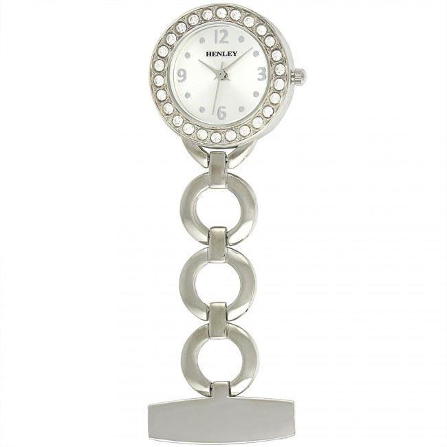 Buy Henley Ladies Fashion Jewellery Fob Watch Silver with polished round case set with diamante crystals. sunray silver dial with quarter arabic numbers and stud index. colour co-ordinated diamond cut hands. polished ring link fob with silver pin clip. japan quartz movement. henley pink and white paper presentation box. Buy fob watches for sale from Branded Watch Sale.