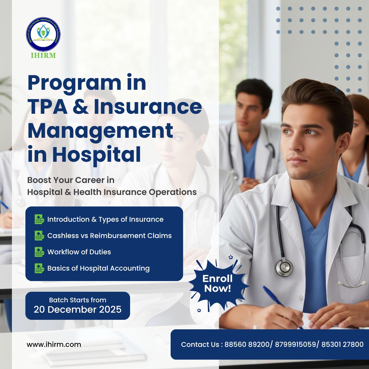 Boost your career in hospital and health insurance operations with IHIRM’s Program in TPA & Insurance Management in Hospital, a professional TPA insurance course designed for those seeking practical, job-ready health insurance courses and the best insurance courses online in India.