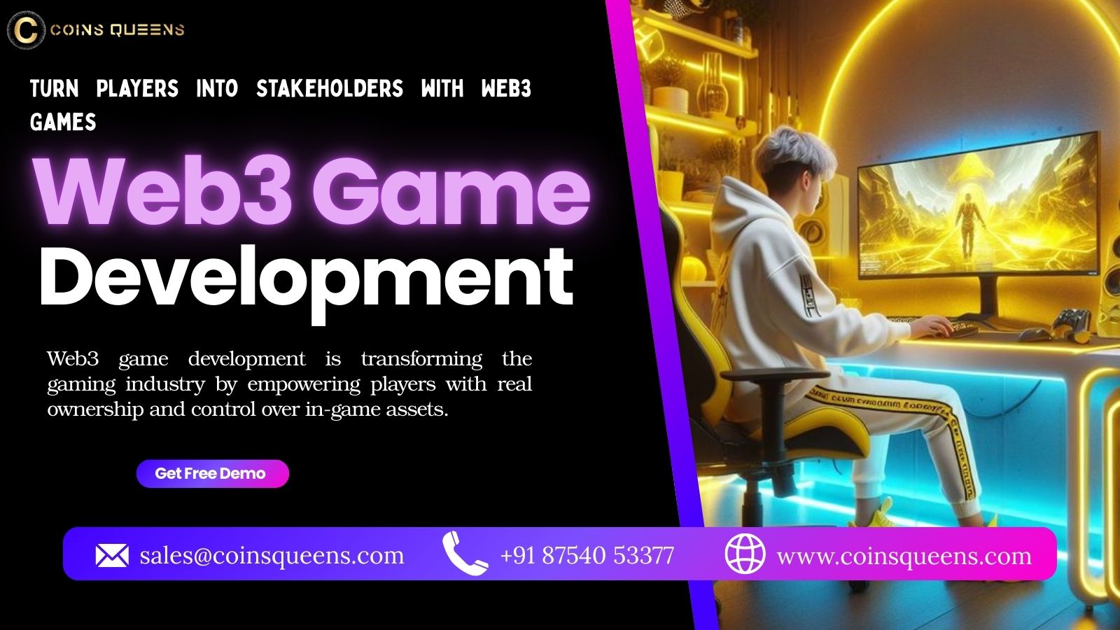 CoinsQueens offers the best Web3 Game Development services that transform traditional gaming into a new business opportunity. With Web3, gamers are not just players, they become real stakeholders by owning in-game assets through blockchain technology. This creates trust, transparency, and better engagement, making your gaming platform more profitable and future-ready.