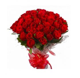 This is an enchanting bouquet of red roses and dracaena leaves in colorful paper packaging with ribbon bows. The bouquet is expertly arranged with elegance. Gift this today to the special people of your life and delight them to the core of their hearts. 50 red roses with green fillers in cellophane wrapping with ribbon bow on it. This flower bouquet is best for any occasion that includes birthday of your love, anniversary, on first day, for wedding and so on. So, visit our website and purchase these lovely flowers bouquet with fresh red roses.