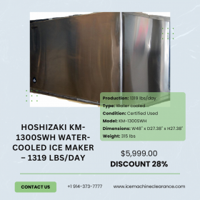The Hoshizaki KM-1300SWH is a certified used water-cooled ice maker that produces 1,319 lbs of crescent ice daily, making it ideal for high-demand environments. This stackable unit delivers Hoshizaki’s signature clear crescent cubes with reliability and efficiency. Designed for 220V, 1-phase with a neutral wire connection, it operates smoothly in commercial settings. Fully inspected, in excellent condition, and backed by a 90-day warranty, this machine is available at 28% off the original price. Now $5,999 (MSRP: $8,315), with $399 shipping and financing options from $165/month. Order today while stock lasts!