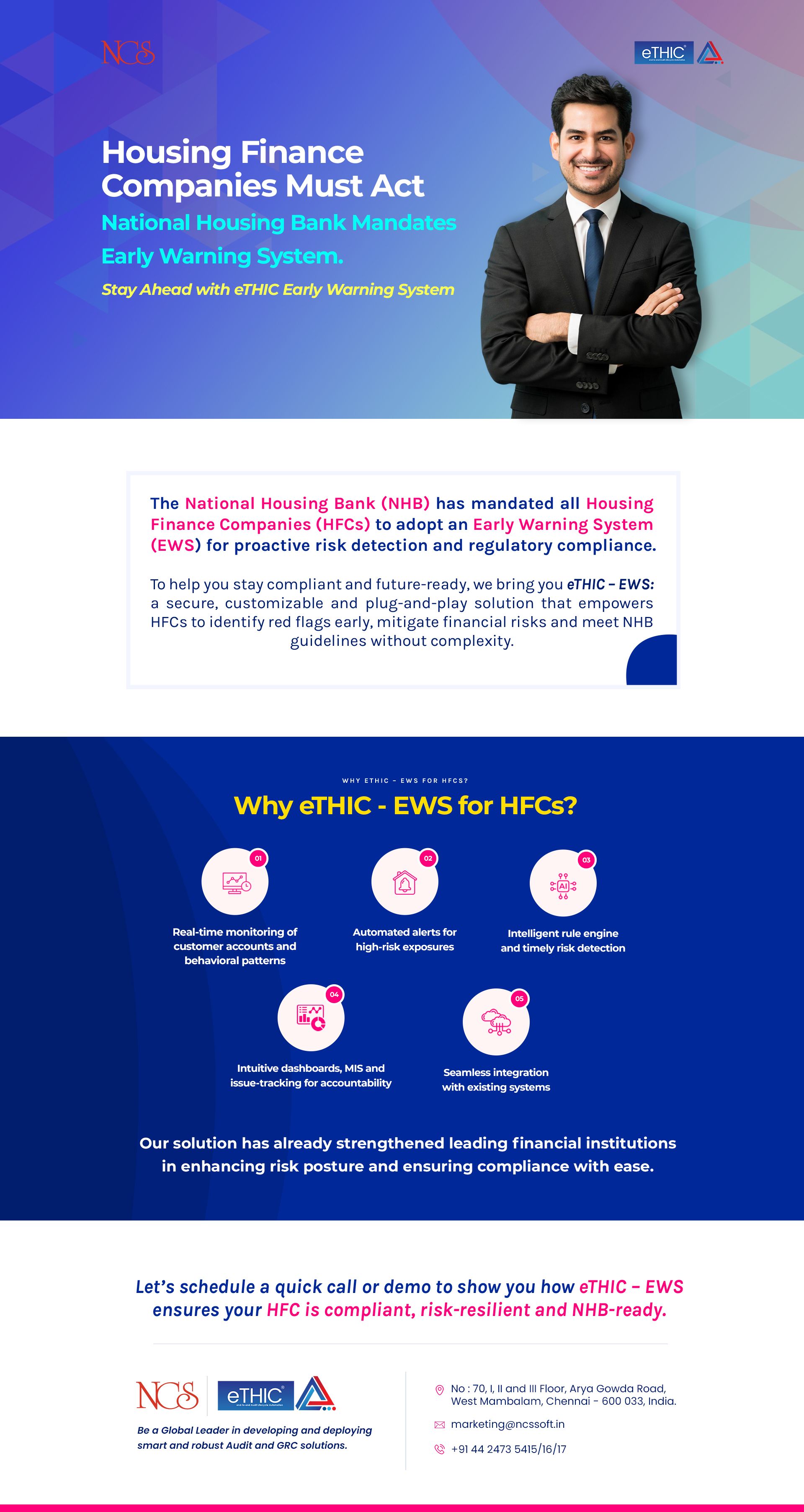 The National Housing Bank (NHB) now mandates all HFCs to adopt an Early Warning System. Stay compliant and future-ready with eTHIC – EWS, a secure and customizable solution for proactive risk detection and regulatory compliance. Be NHB-ready. Be risk-re