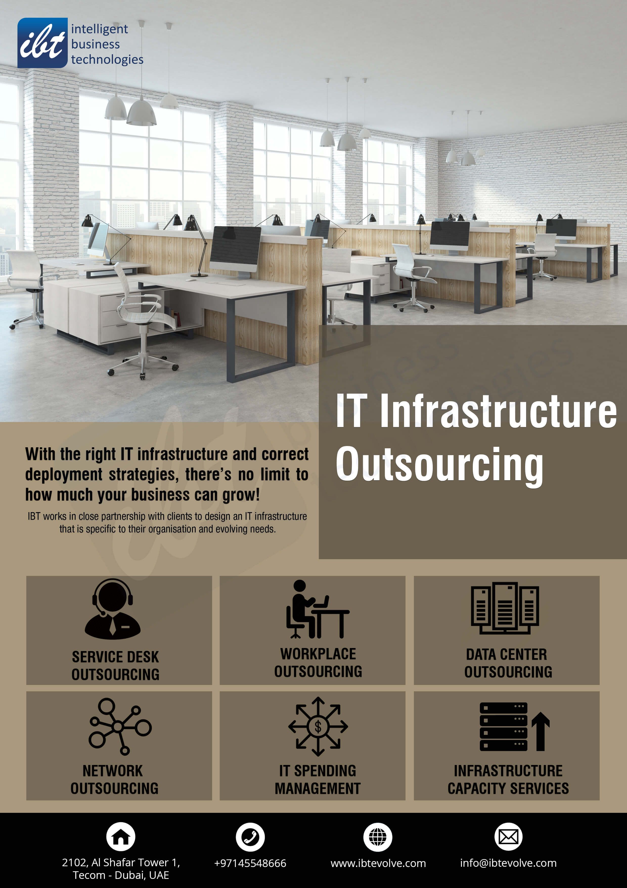 IBT delivers digital transformation and end-to-end ICT services from ideation to execution, facilitating over 1000 enterprise clients to outperform the competition. “Born digital,” IBT takes an agile, synergetic approach to devising customized solutions across the digital value chain. Our broad expertise in infrastructure and applications management turns IT into a decisive asset. Whether you need to drive your business more efficiently or expedite revenue growth, we can get you there.
