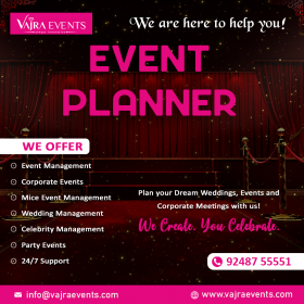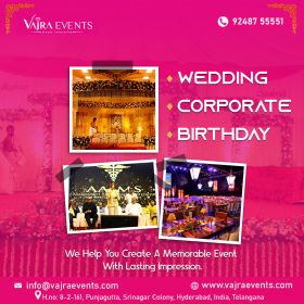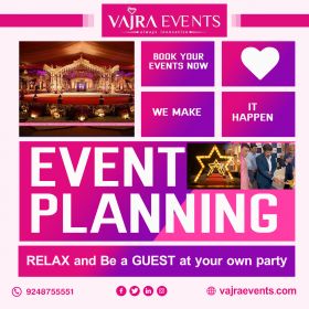 "Vajra Events is a full-scale event management company and a top corporate event management company in Hyderabad. proud to offer services in wedding planning, corporate events, movie promotions, and audio launches. best event managers in Hyderabad. We believe that experience and excellent taste are the foundation of every successful event. Event Organizer with an Exclusive Wedding and event management company based in Hyderabad and networking all over India. Events management more than skill is an art. An art of understanding someone else’s vision and bringing it alive into a tangible product. Event Organizer Services and Exclusive Wedding Planner Hyderabad Vajra events make your memorable events with us and will be an unforgettable event in life. We started our journey with a wedding and here we are today, doing corporate events, audio Launches, Brand promotions being a few, to begin with. Our services also include Birthday parties, exhibitions, trade shows, award functions, School and college Fests, Celebrity Management, fashion shows, etc We are here to let you enjoy your piece of cake while we walk the extra mile for you and offer a “One-stop Shoppe” for all your event management requirements. An Event Organizer in Hyderabad Developing events after a careful study of the brand and considering its objective. Delivering the best possible to generate maximum response towards the products and clients. Deciphering the response: Project Evaluation and Feedback. These EVENTS give an insight into the actual size and help us in defining the best strategy for our clients. An Exclusive Event Organiser in Hyderabad.