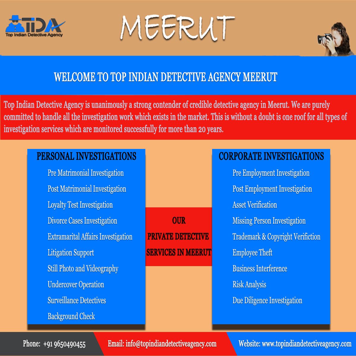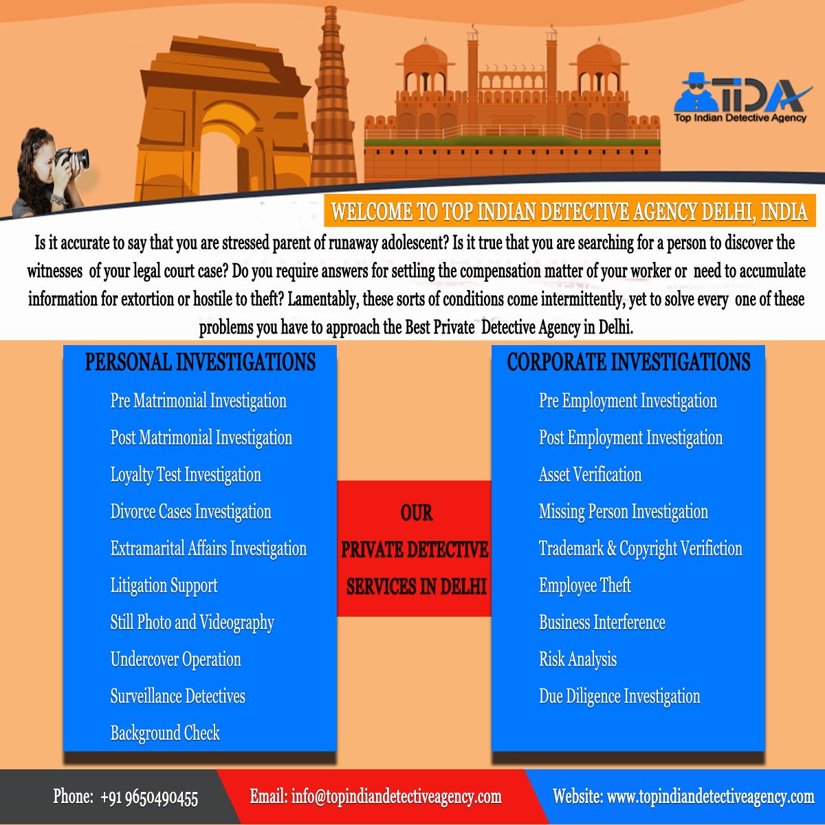 Top Indian Detective Agency is the Private Investigation Agency in Delhi. Due to the dedication towards the work as an investigation case whether it is easy or complex. All resolves within time without any missing of the proof which could be evidence to prove someone guilty or convict. It is mostly observed that every single information can be obtained from the single click of a mouse but some things have to search through the strategic planning. Various Services serves by this agency such as Pre Matrimonial Investigation, Post Matrimonial Investigation, Loyalty Test Investigation, etc.