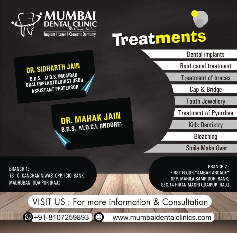 Mumbai Dental Clinic assure you to provide Best Dental Treatment Services in Udaipur , We have all the latest technologies. Dr. Siddharth Jain and Dr.Mahak Jain are highly qualified and renowned specialist dental surgeons. They routinely perform complicated surgical, esthetic and restorative procedures apart from the usual dental treatment. Call us- +91-8107259893