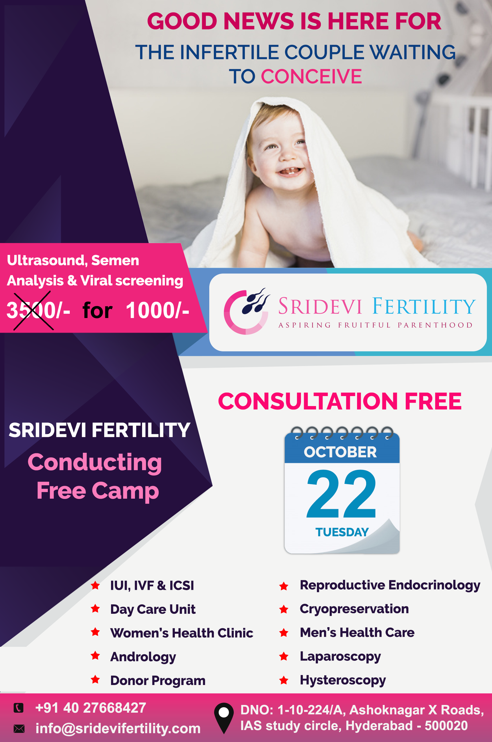 View All →Free consultation camp on 22nd October'19 at Sridevi Fertility Centre | best ivf centre in hyderabad